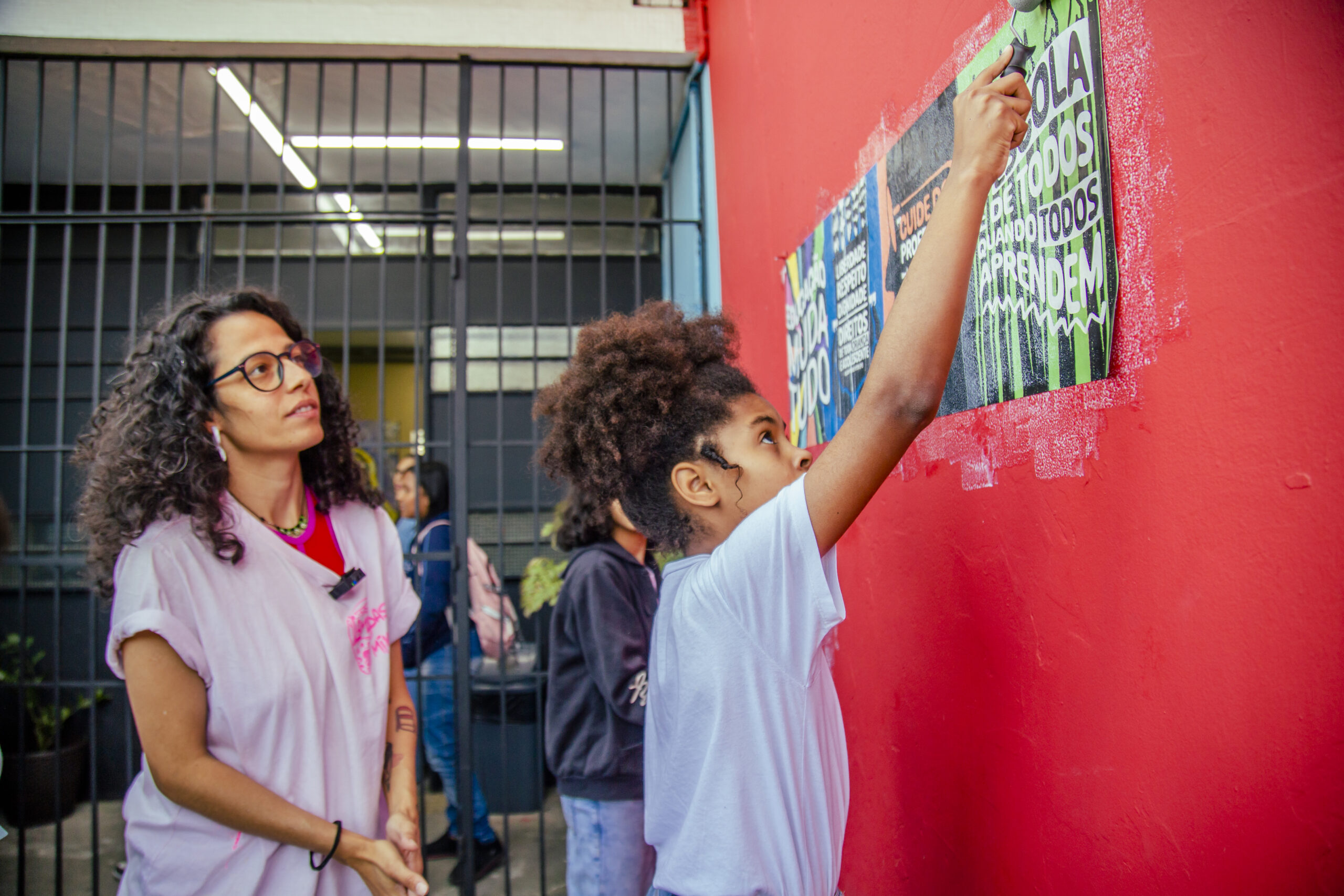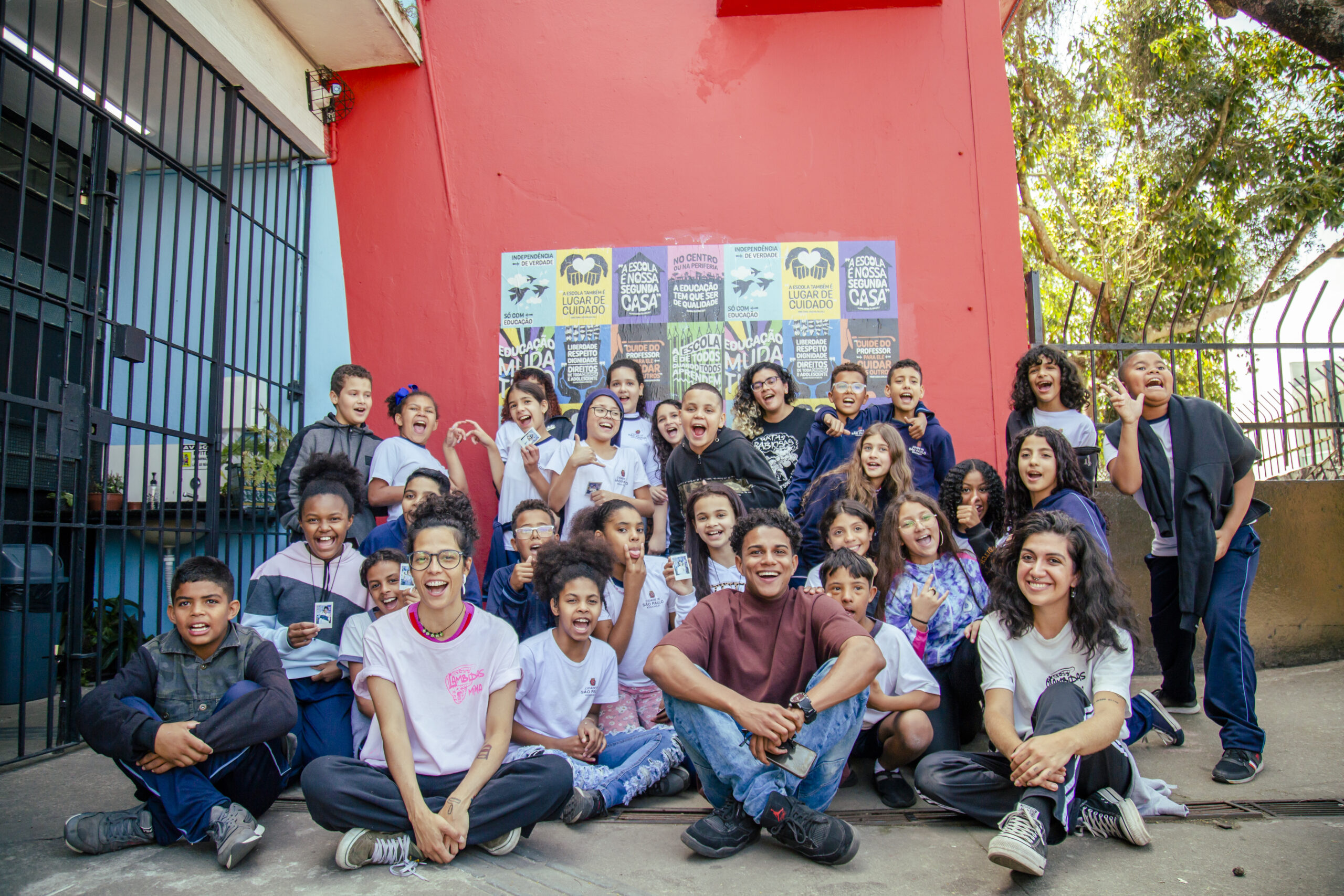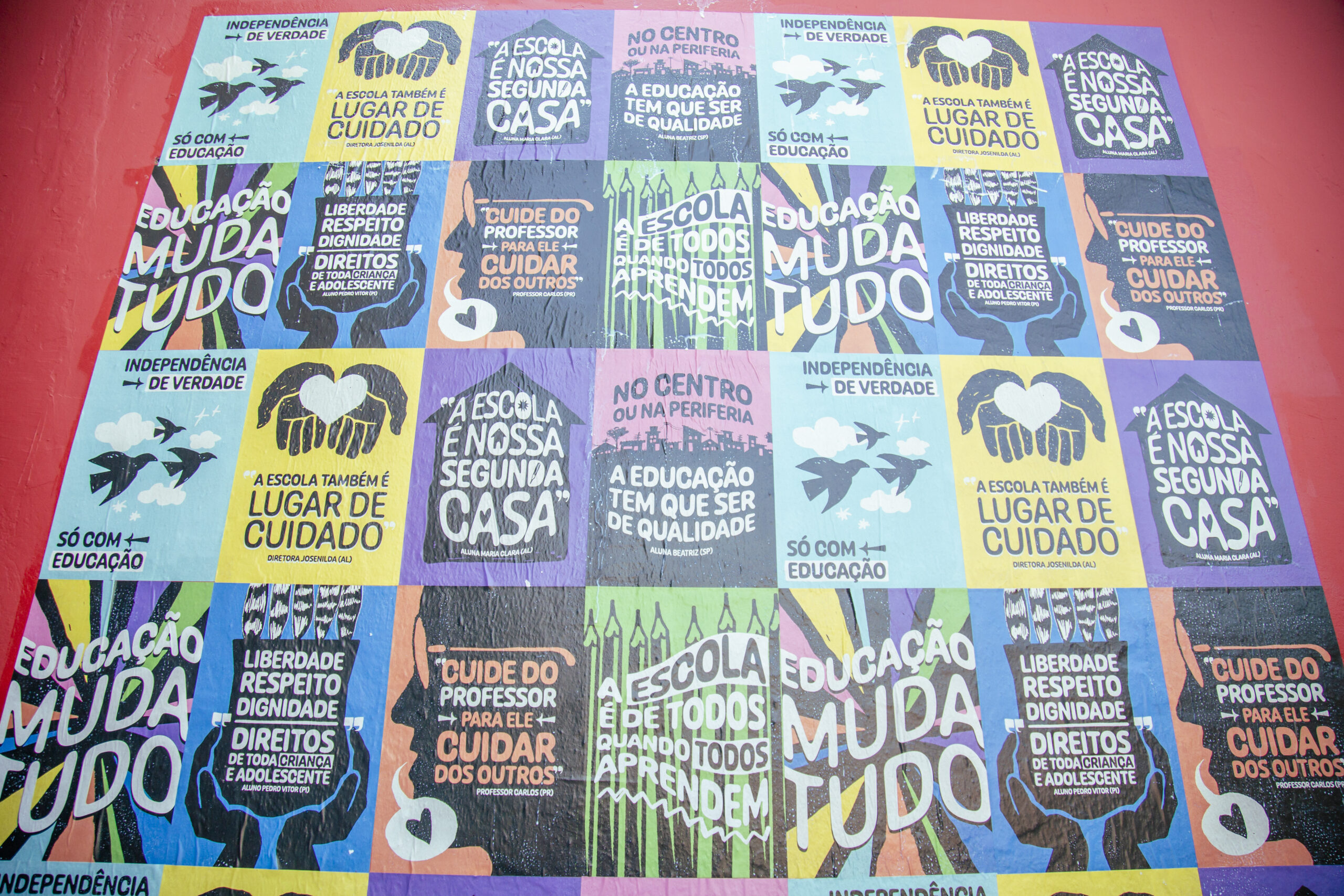 Recolhemos seus pensamentos e os transformamos em arte, com o apoio do artista e educador Douglas Gonçalves. Em uma ação de cocriação, estampamos alguns dos desejos para o Ensino Público em lambe-lambes e realizamos uma intervenção artística com a comunidade da EMEF Madre Joana Angélica de Jesus, em Guaianases, zona leste de São Paulo capital, com o coletivo LambiDasMina e apoio da rede Conectando Saberes. Ali sentimos que fomos presenteados de muitas formas: com o brilho no olhar de cada criança; com a acolhida e energia de toda a comunidade escolar e com a experiência das profissionais que ali trabalham. Baterias recarregadas para reinvidicar políticas públicas que transformem a Educação!