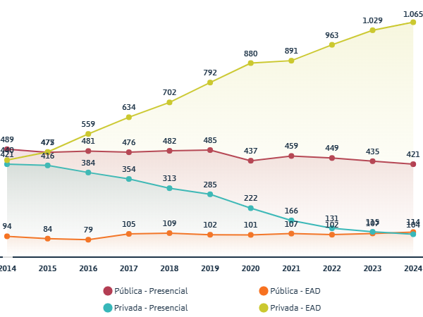 Em 2014, os cursos de licenciatura na modalidade a distância somavam 534 mil matrículas (37% do total). Em 2024, o número chegou a 1,18 milhão, o equivalente a sete em cada dez estudantes. O crescimento foi puxado pela rede privada, que passou de 440 mil (30%) para mais de 1 milhão de matrículas (63%), enquanto a rede pública manteve-se praticamente estável. Mais detalhes aqui.