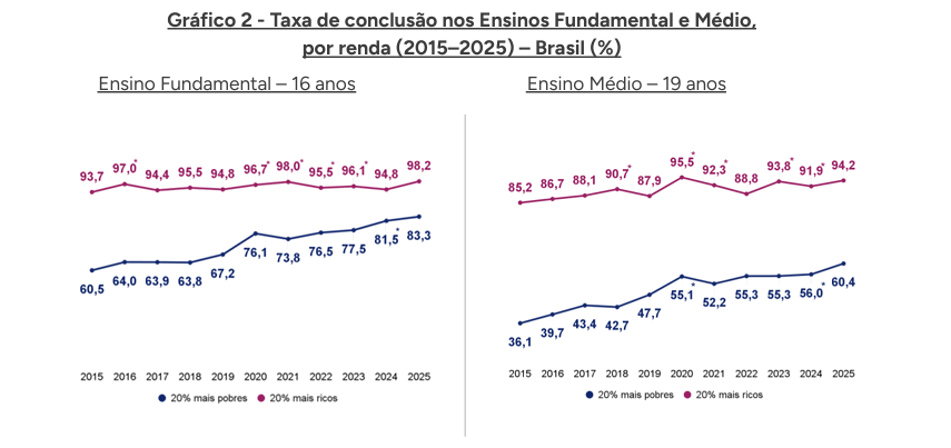 O estudo, com base na Pesquisa Nacional por Amostra de Domicílios Contínua (Pnad-C) e do seu Módulo Educação, do IBGE , analisa a conclusão do Ensino Fundamental até os 16 anos e do Ensino Médio até os 19 anos, entre 2015 e 2025, e evidencia que as desigualdades na conclusão das etapas da Educação Básica apresentam múltiplas facetas, com maior intensidade no Ensino Médio. Persistem também disparidades regionais, além de diferenças significativas associadas ao perfil socioeconômico, racial e de gênero.