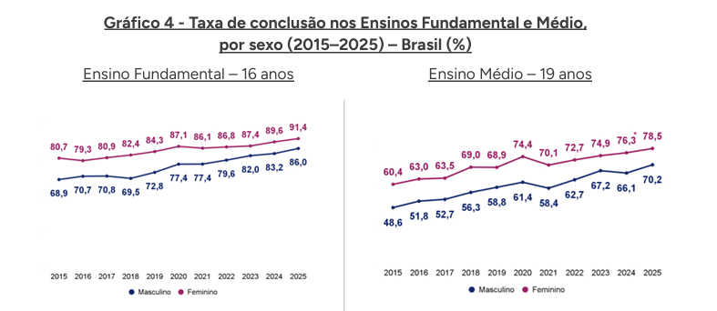 A análise nacional mostra avanços importantes na última década. No Ensino Médio, por exemplo, a taxa de conclusão do Ensino Médio registrou avanço expressivo, partindo de 54,5% em 2015 para 74,3% em 2025. Apesar dos progressos, um em cada quatro jovens de até 19 anos não concluiu a Educação Básica, sendo que cerca de 400 mil brasileiros nesta faixa etária estão fora da escola porque precisam trabalhar ou perderam o interesse pelos estudos.